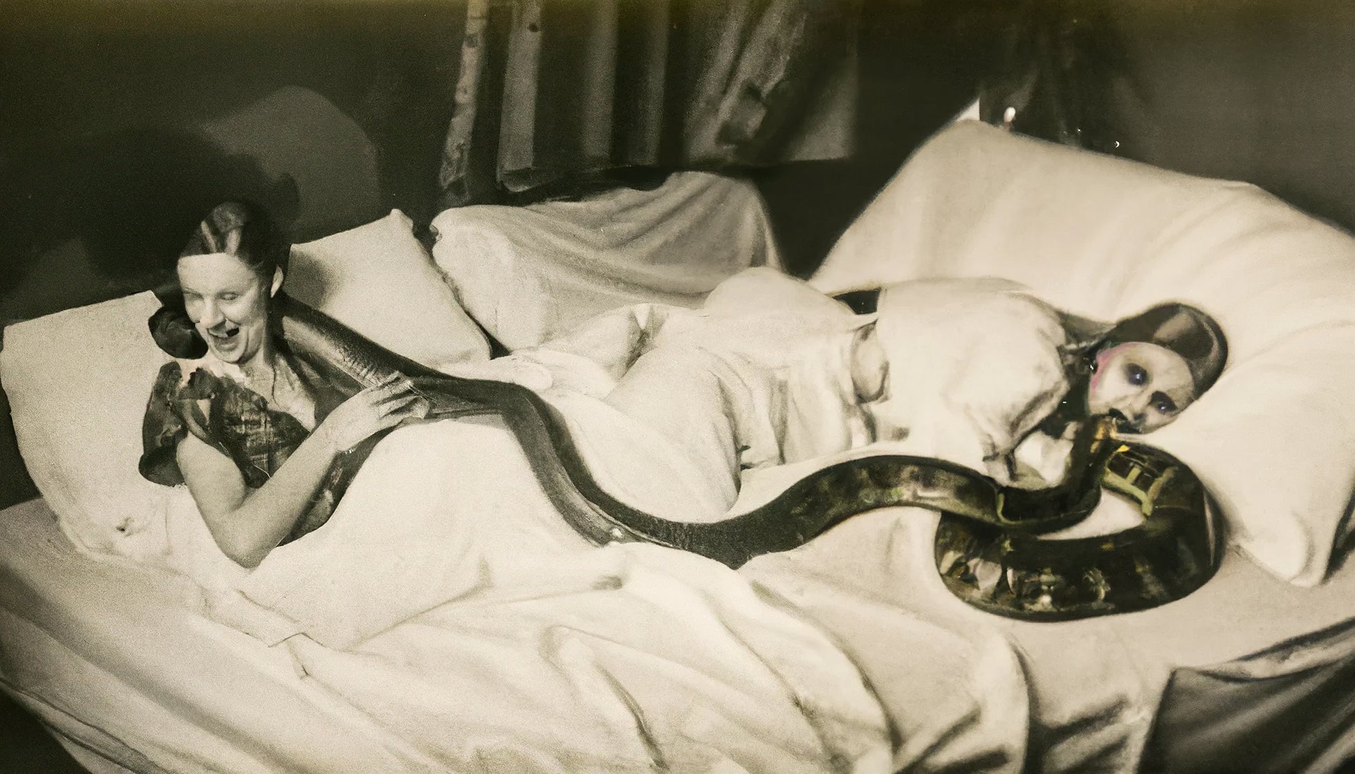 Eternity is a key work within Boris Eldagsen's Pseudomnesia I series and exemplifies his radical questioning of photographic truth. The image initially evokes the aesthetics of a historical snapshot: graininess, lighting, and staging allude to a supposedly analog heritage. But this familiarity quickly tips into the uncanny. The scene appears simultaneously intimate and grotesque, realistic and impossible—a visual paradox that defies any documentary interpretation.