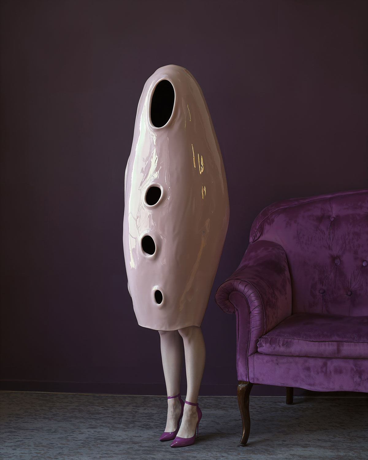 The feminine is presented here not in an idealized way, but ambivalently and embodied. The purple heels, the bare legs—exposed, almost awkward—anchor the figure in a vulnerable present. The shell, however, remains impenetrable, a cocoon that simultaneously protects and isolates. It suggests fertility and silence, incubation and withdrawal—a body in transition that doesn't yet know what it will transform into.