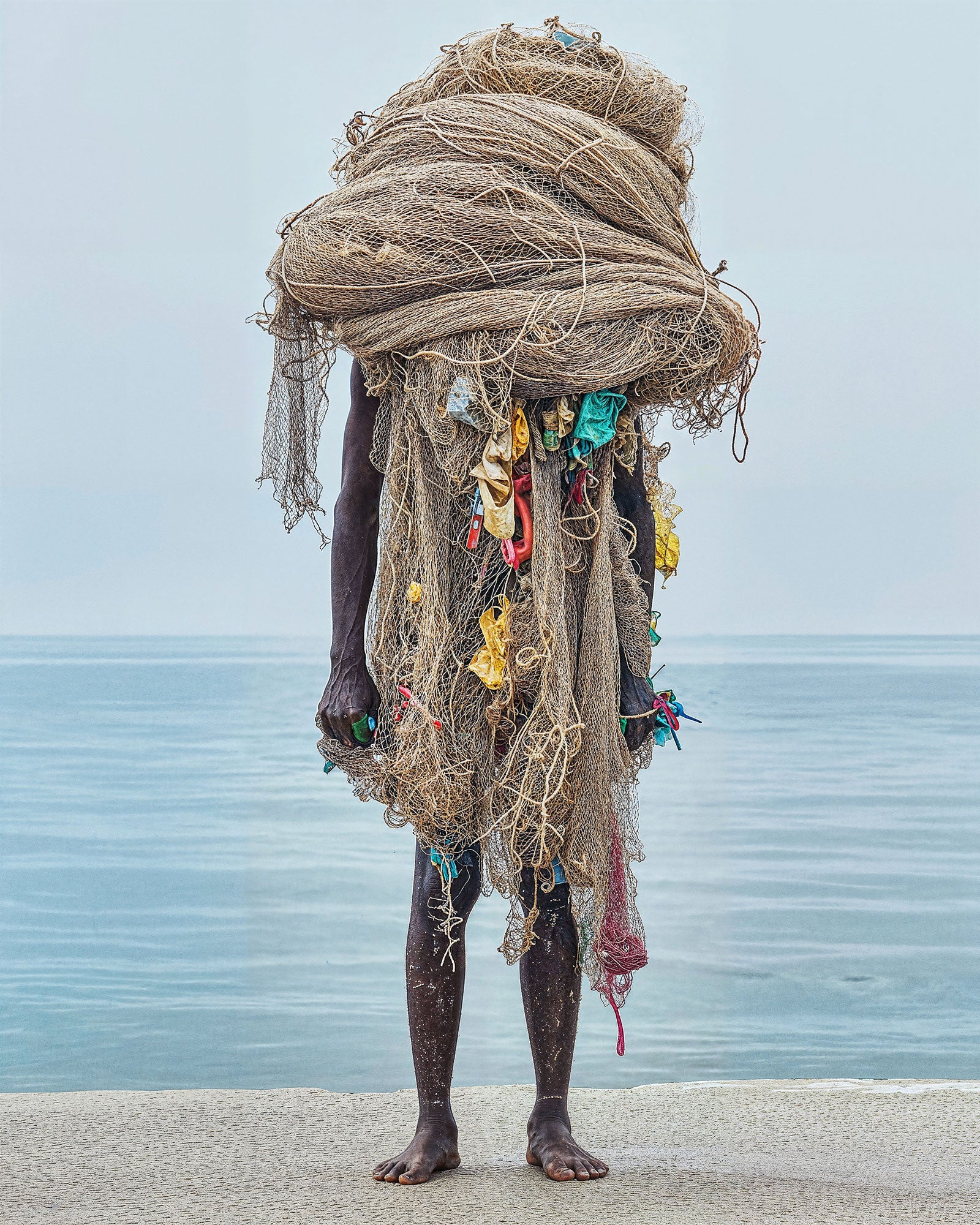 A figure shrouded in nets, driftwood, and plastic fragments. No face, just a body. No place, just transition. Refugee tells of a journey of no return—of a departure that is more than a movement: a leap into the unknown.