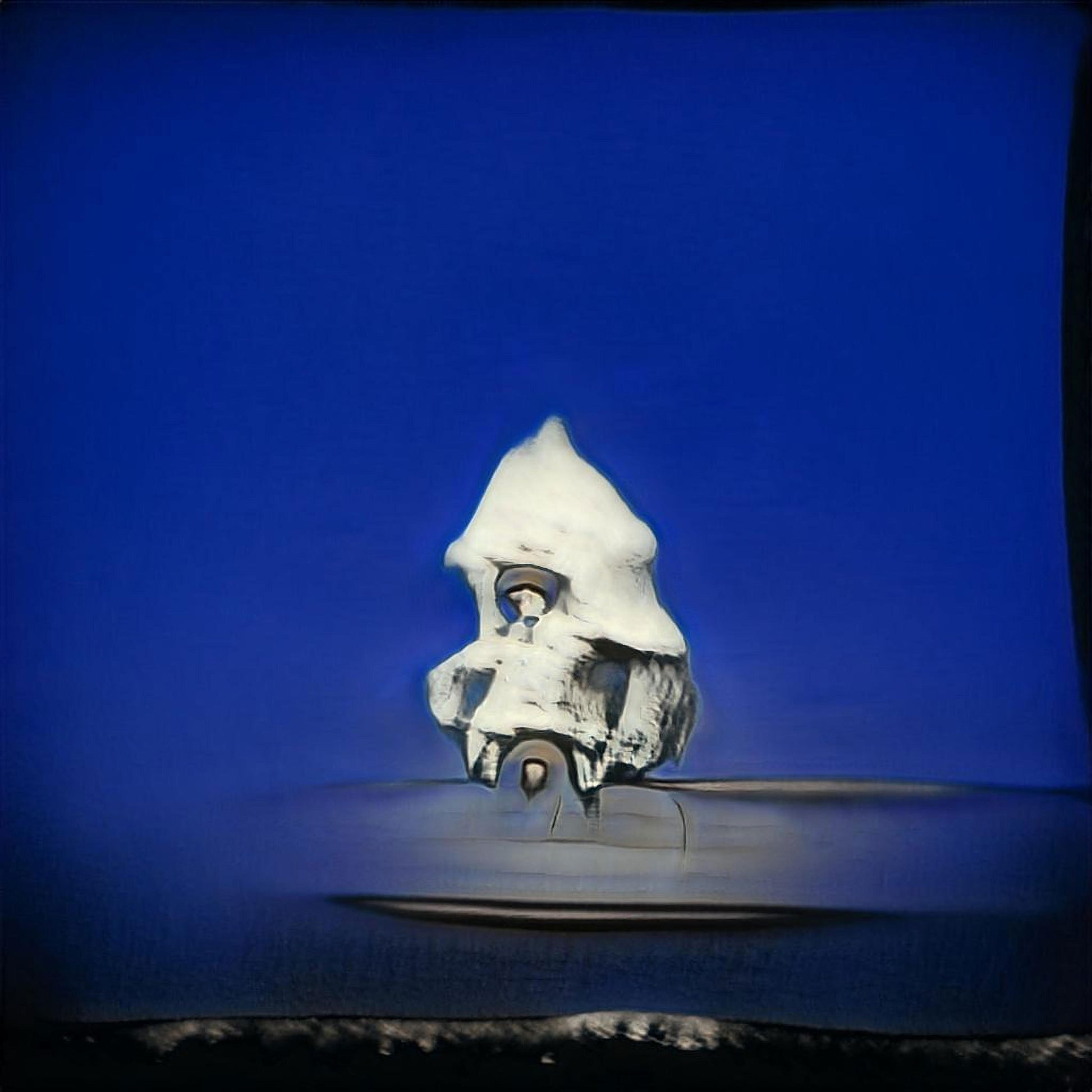 In Artificial Memories 07, a structureless, almost sacred figure rises against an endless, surreal, deep blue background. Like an archaic skull, a temple of memory, or a fossilized algorithm, the object sits enthroned in an imaginary landscape. Its form oscillates between rock and flesh, architecture and anatomy.
