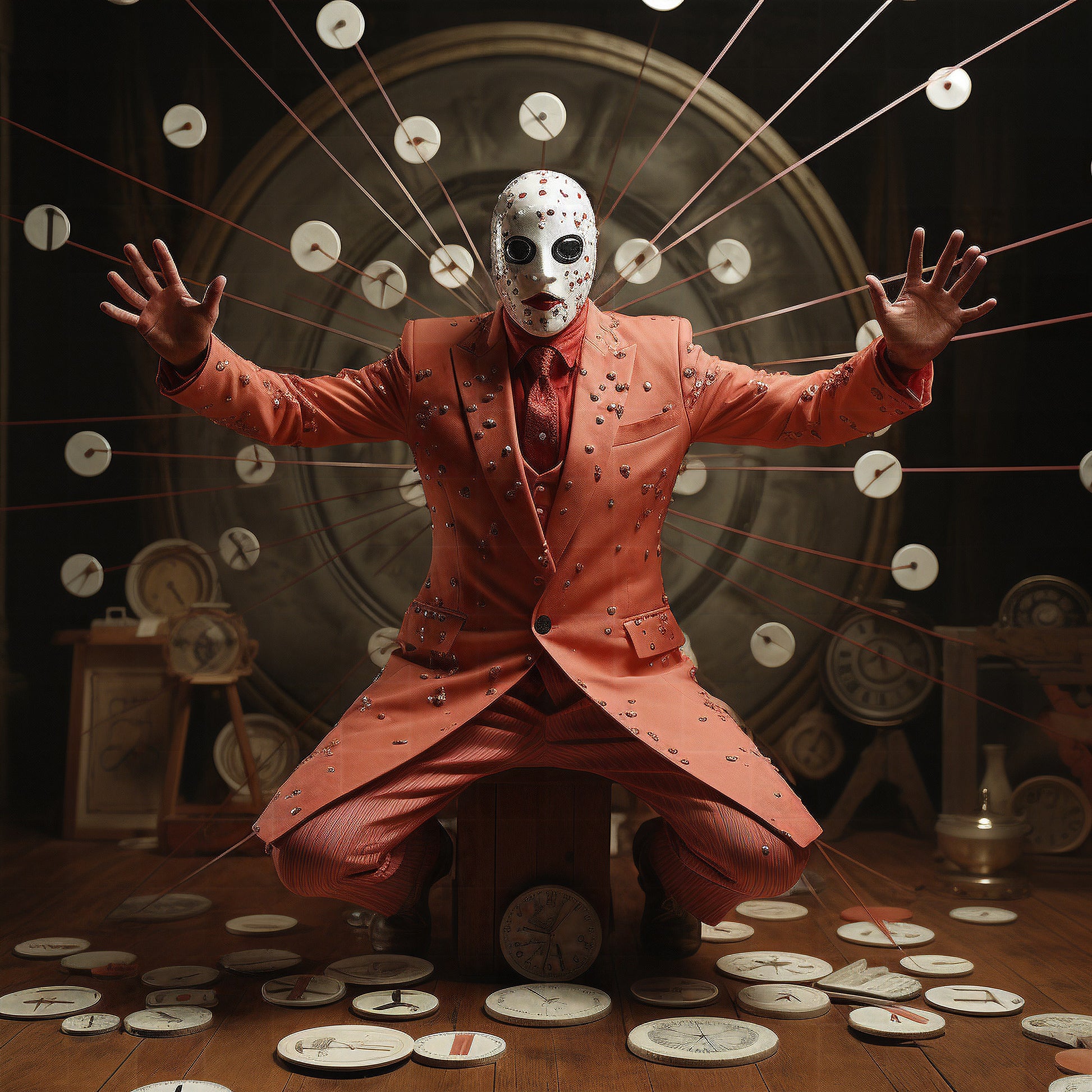 With Wizard, Merzmensch conjures a surreal vision of control, chaos, and artificial divination. At the center of the composition is a masked figure in a sharply tailored coral-red suit trimmed with metallic spikes like a modern-day shaman connected to an invisible network of time. Around him swirl discs, clocks, and dials—symbols of measurement and destiny—connected by red threads that radiate like a geometric ritual.