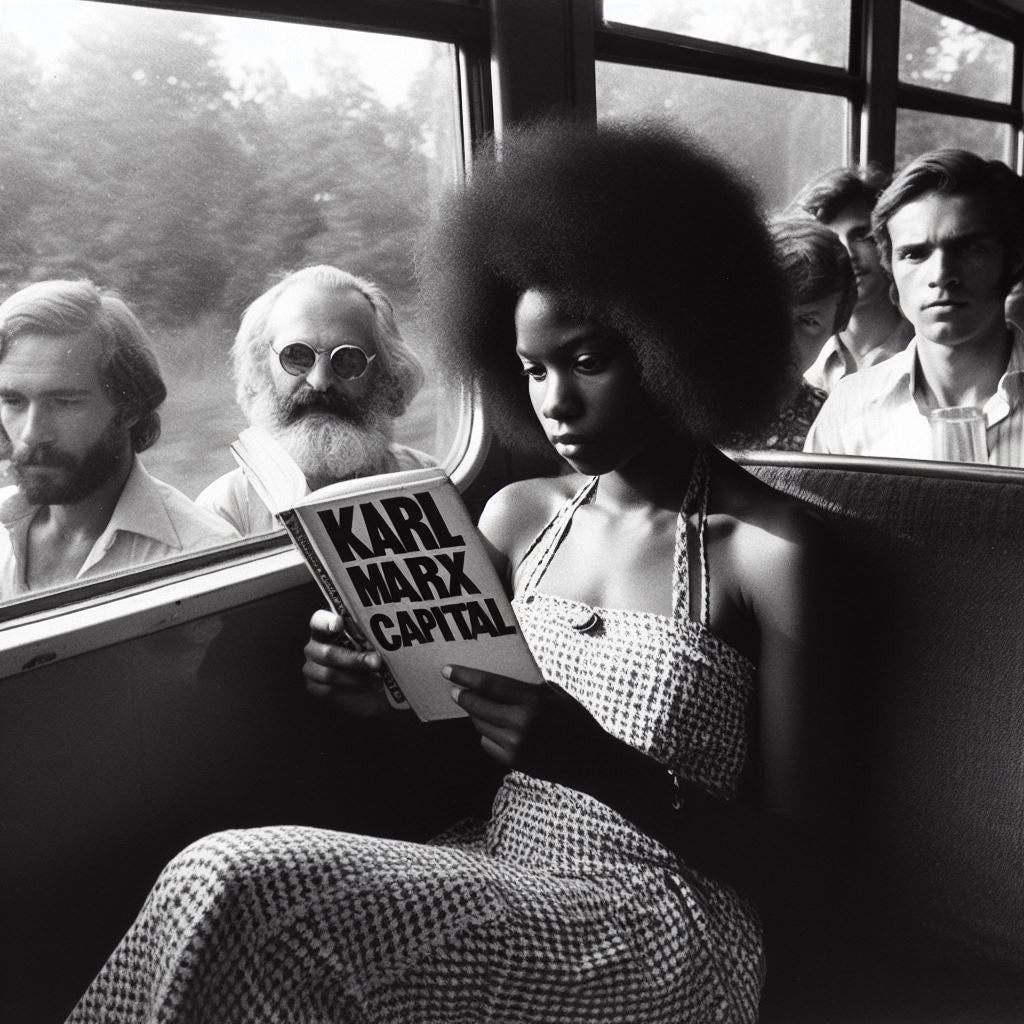 A young woman reads Karl Marx's Capital in the cramped space of a train compartment, while bearded men, almost like reincarnations of the author himself, peer curiously through the window. The scene oscillates between irony and seriousness: here the historical gravity of one of the most influential writings of modernism, there the lightness of the everyday gesture of reading. Von Wolff creates a tension between theory and everyday life, between economic analysis and the individual practice of thinking. But the perfect composition, the precise interplay of glances and reflections, betray the artificial origins. Just as Marx questioned the relationship between value and commodity, von Wolff makes it clear that images too are commodities - products that only simulate authenticity in order to create cultural significance. The work shows us that the question of "value" is no longer just an economic one, but is also negotiated in media and aesthetic terms.