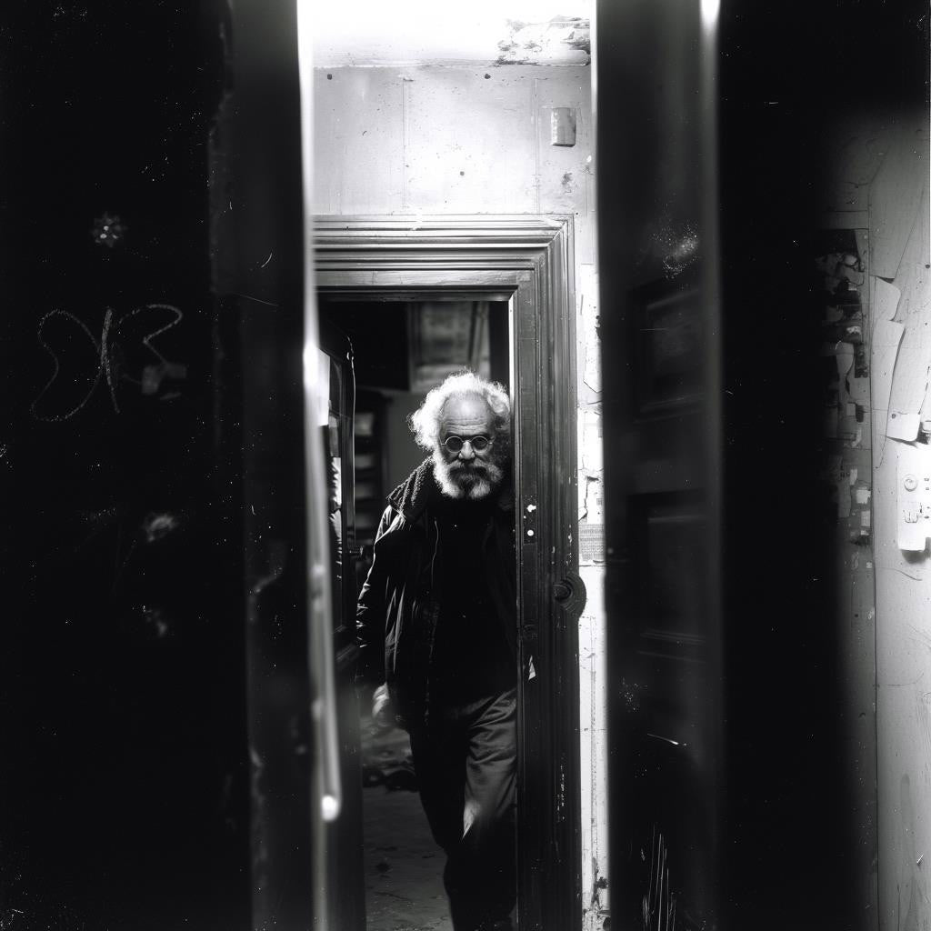 Und er steht in dieser Tür – noch nicht ganz eingetreten, nicht ganz gegangen – als würde er entscheiden, ob die Geschichte ihn noch verdient.